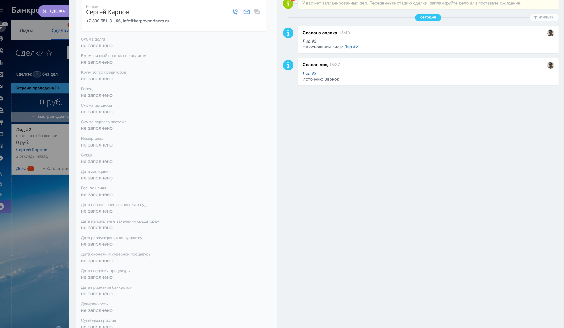 Работа в системе сразу будет происходить по уже известным Вам сценариям, со знакомой терминологией. Воронки продаж, пользовательские поля, бизнес-процессы, - всё для юридической практики.